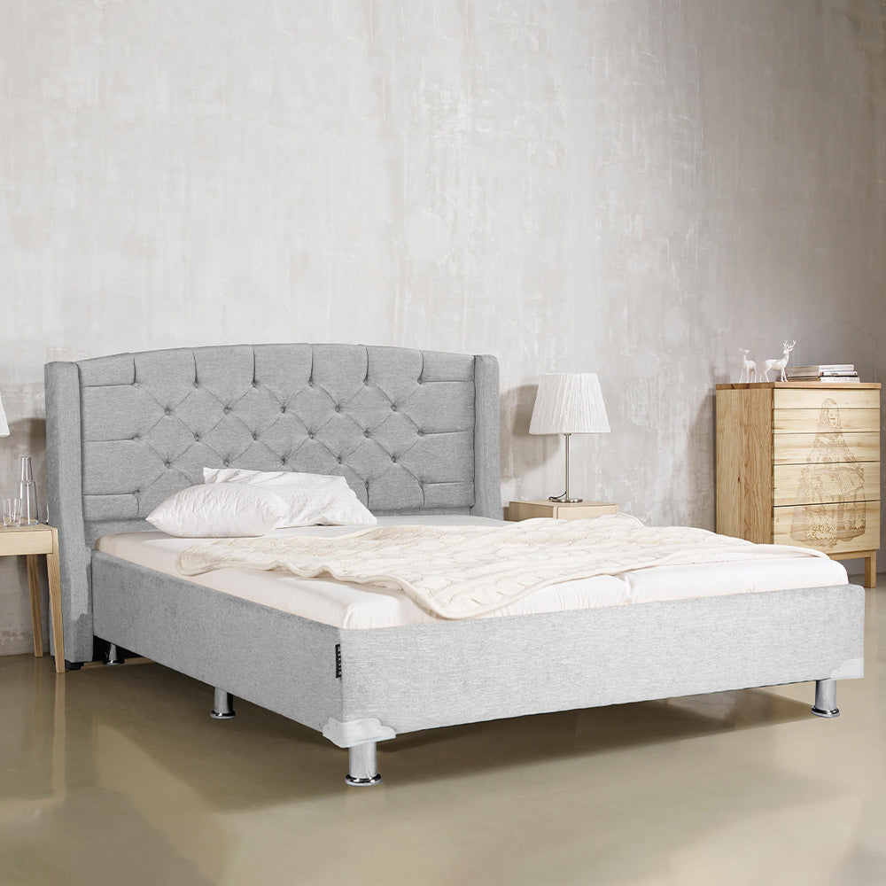 - Box: Estructura de madera de pino reforzada con nitrocelulosa. Tapizado con telas de importación en varios colores suaves al tacto. El producto incluye 6 patas metálicas con una altura aproximada de 10 cm.